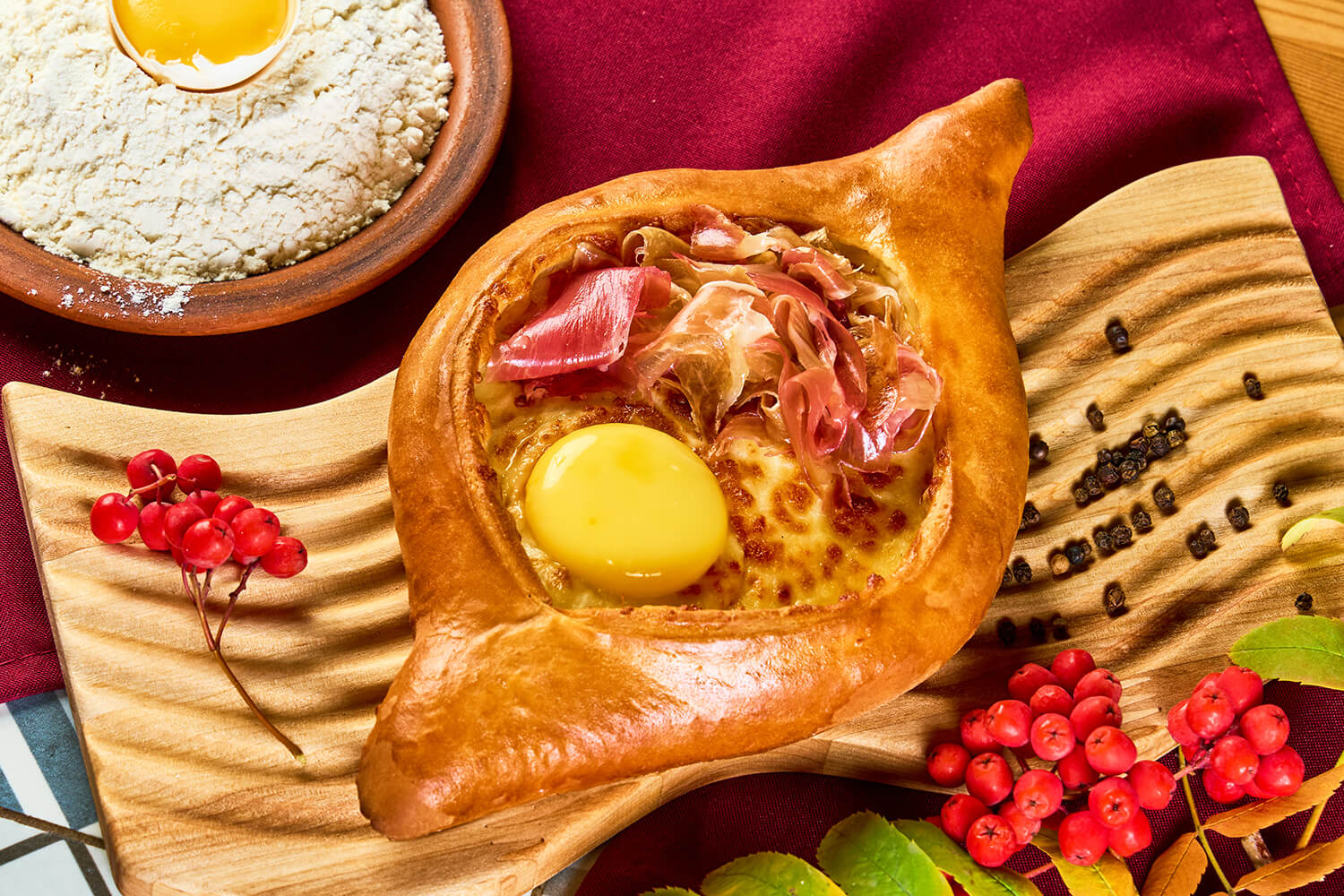 - Хачапури с Пермской ветчиной: пряная Парма в сочетании с жареным сыром, яйцом, специями и румяной выпечкой. (630 руб)