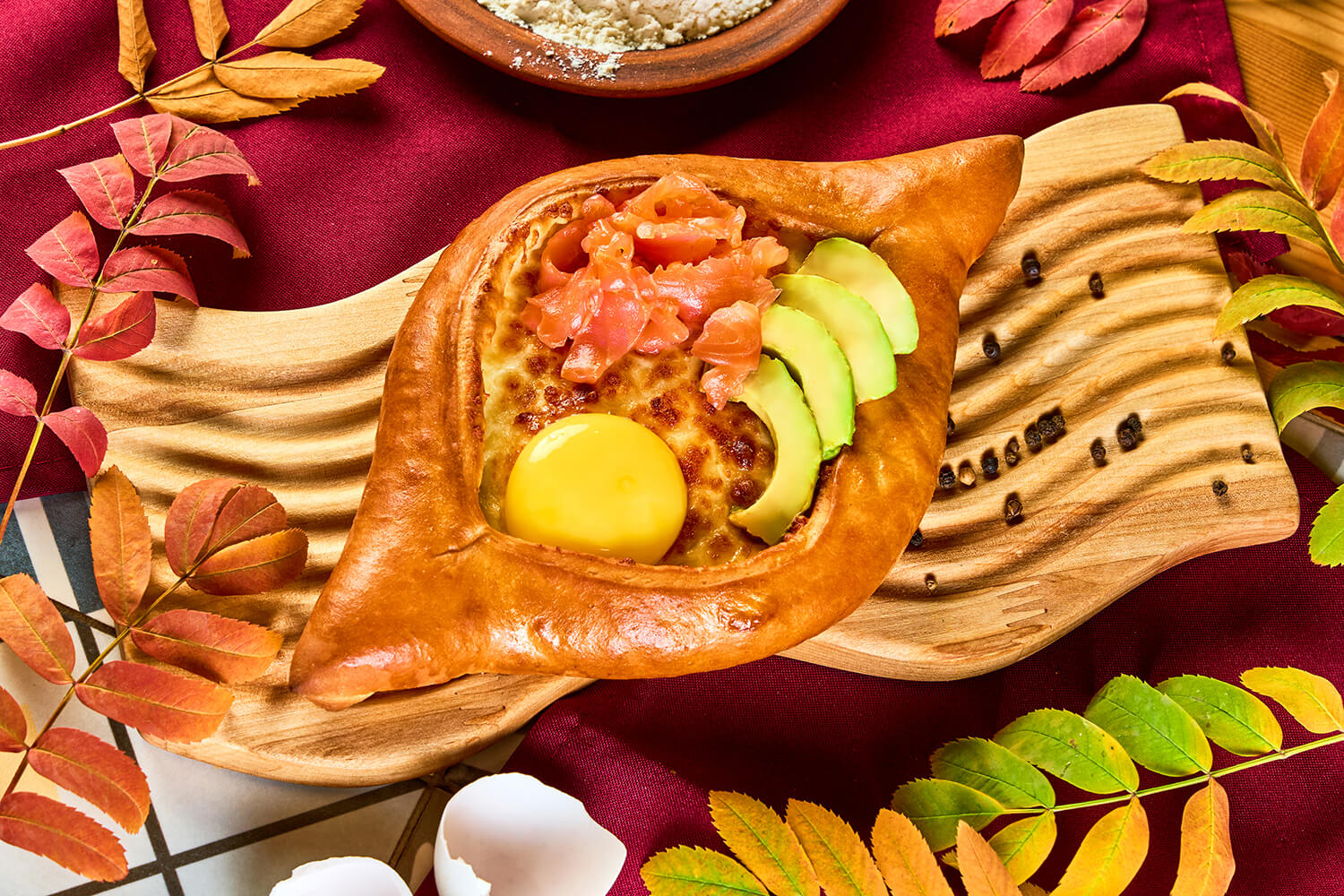 - Хачапури с лососем и авокадо: сливочно-кремовый авокадо со слабосоленым лососем, запеченным сыром, яйцом и ароматной выпечкой. (630 руб)